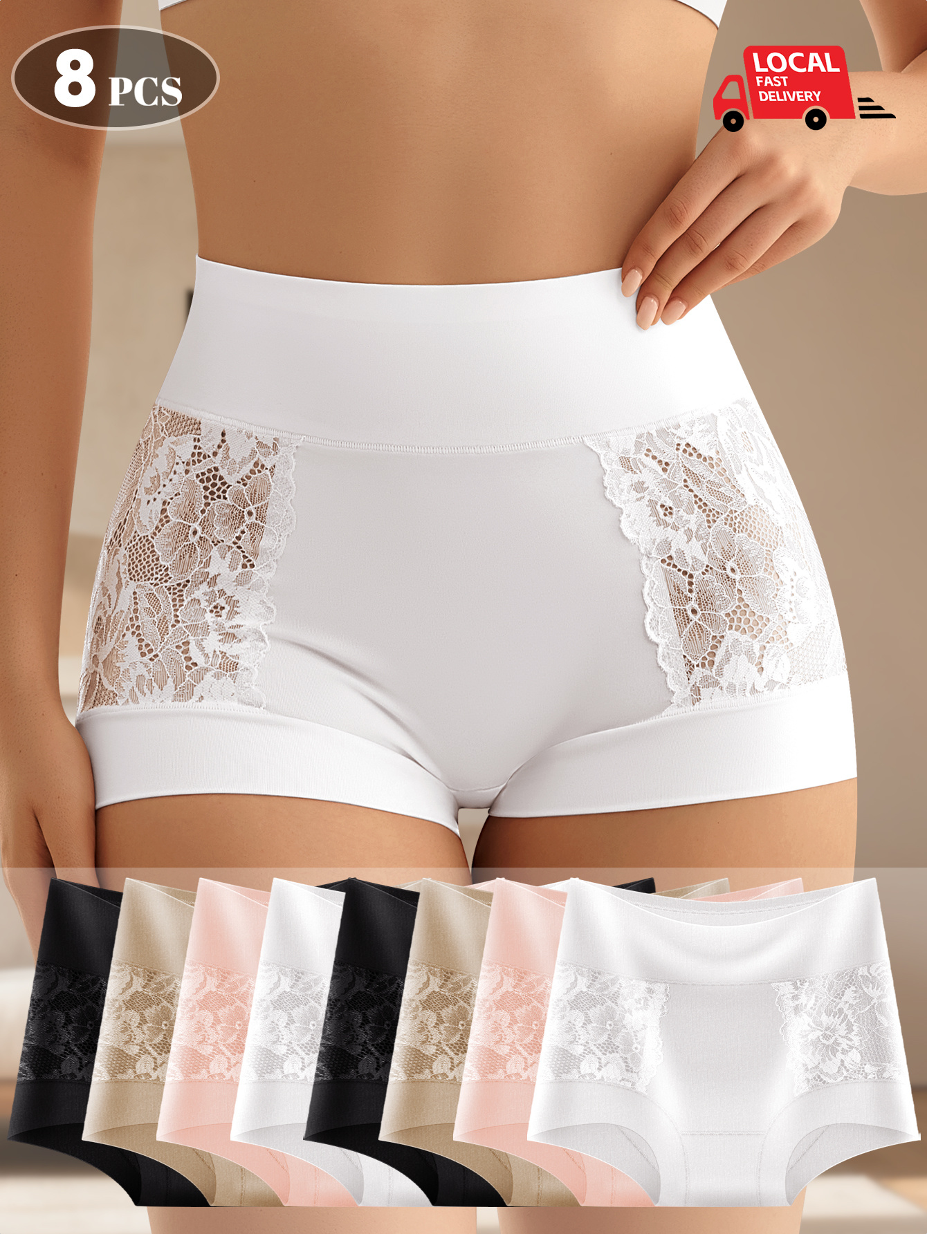 Gydytojo rekomenduojama – 8 vnt. pakuotė – moteriškos aukštu juosmeniu nėriniuotos bokserinės kelnaitės, natūraliai plokštesninančios pilvuką